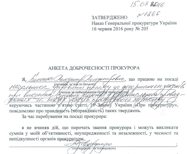 Отметим, что сам Комашко несмотря на свои "адвокатские проделки" заполнил анкету добропорядочности, утверждая что своими действияvи не нарушал закон, не замешан в коррупции и не порочил честь мундира.