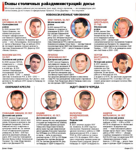 15 серпня 2014 року Президент України підписав довгоочікувані суспільством розпорядчі акти, які фактично змінили обличчя столиці України. Глава держави за поданням Київського міського голови та за погодженням КабінетуМіністрів України замінив шість з десяти голів районних в місті Києві державних адміністрацій.