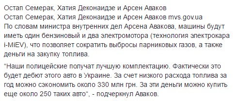 "Деньги, которые Украина получит по Киотскому протоколу, направят на закупку новых гибридных машин для полиции, сообщают в МВД и Минэкологии. Речь идет о Mitsubishi Оutlander PHEV с силовой гибридной установкой. Всего будет потрачено 956 миллионов гривен, полученных от частных японских компаний в рамках Киотского протокола, сообщают в МВД и Минэкологии", - говорится в сообщении.