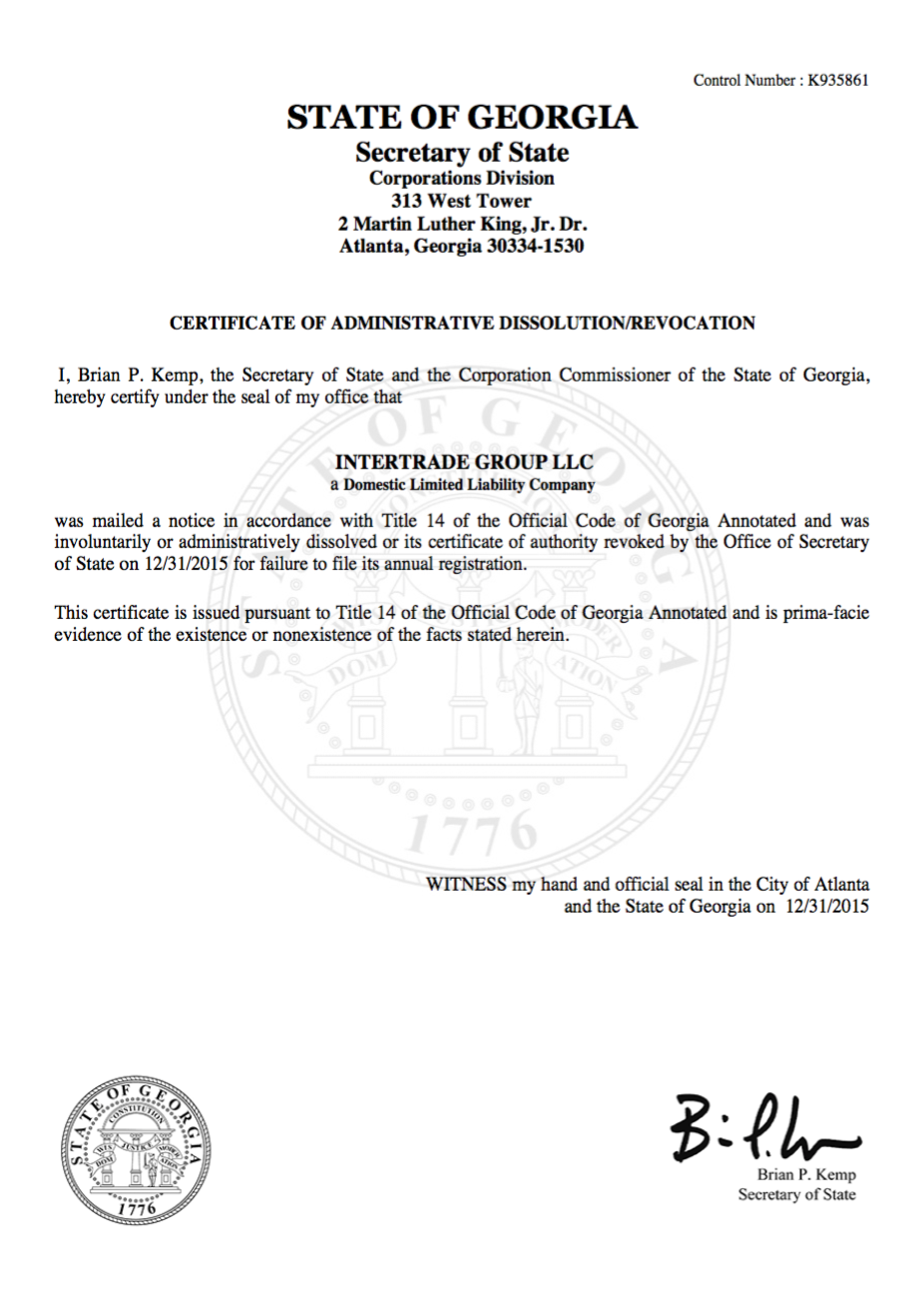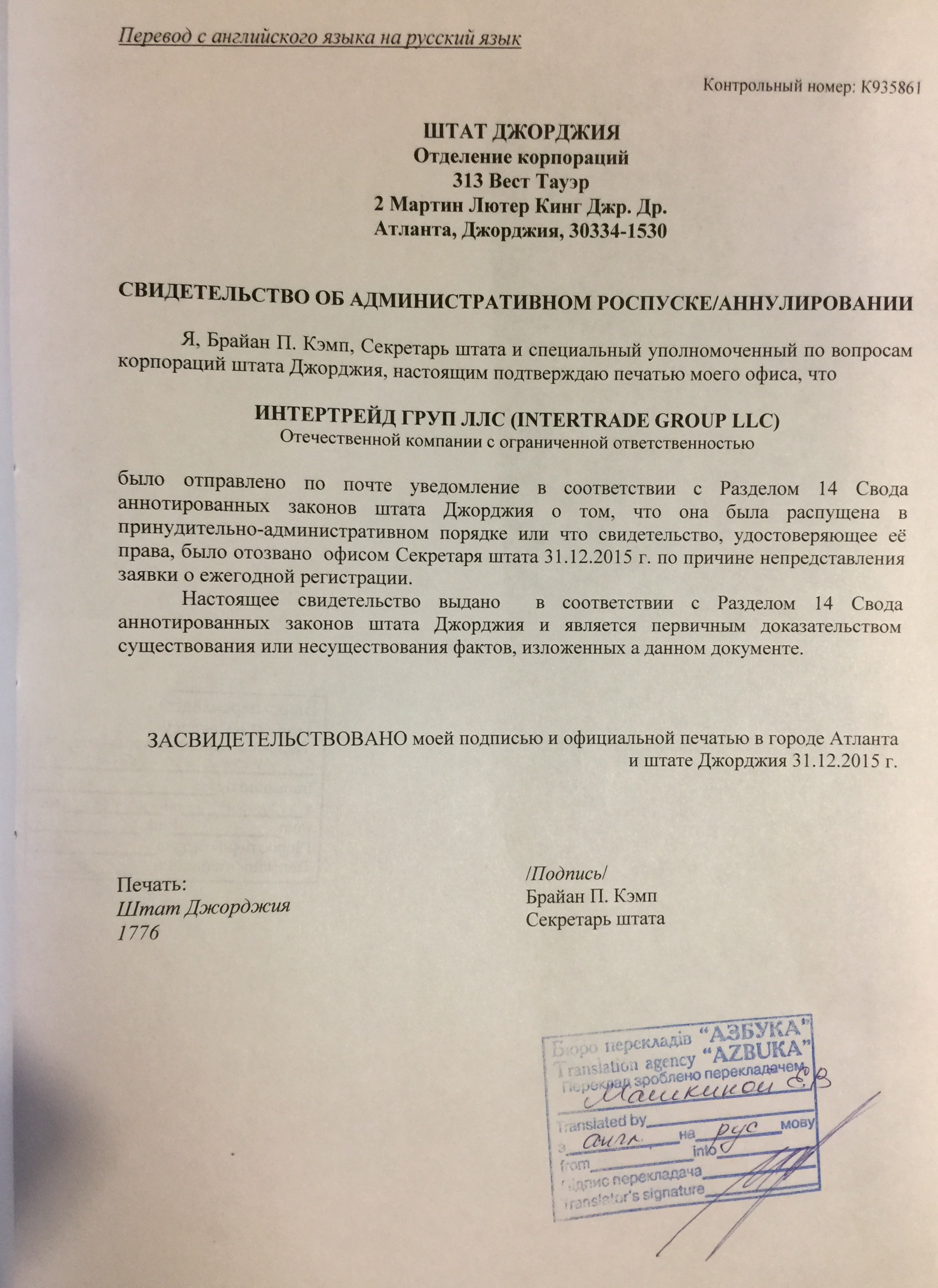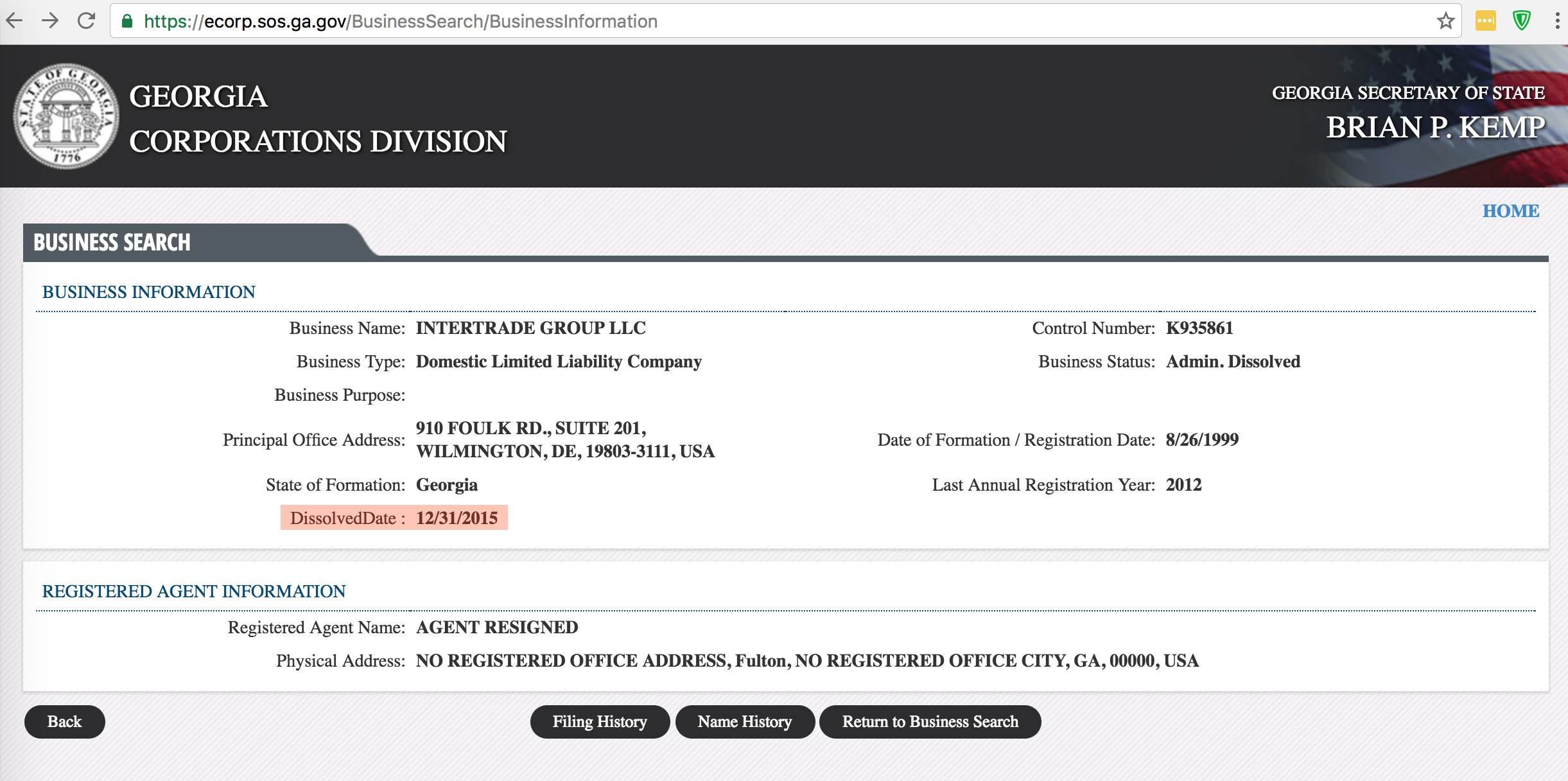 Согласно данным государственного регистранта штата Джорджия, которые получила "ХВ", компания Intertrade Group LLC была распущена в принудительно-административном порядке 31 декабря 2015 года по причине непредоставления заявки о ежегодной регистрации.