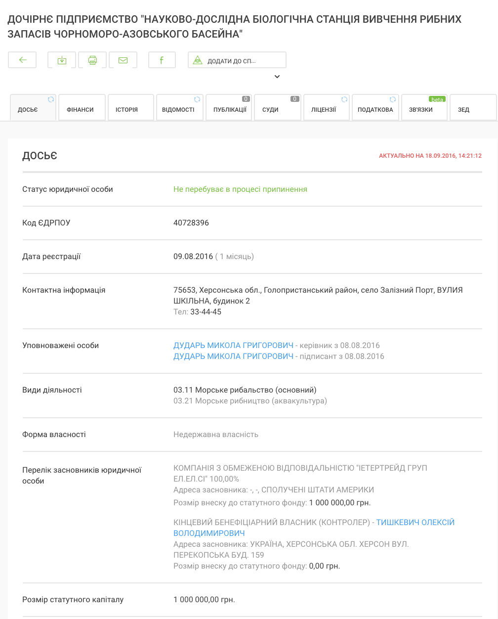 В соответствии с решением учредителя компания решила создать три дочерних предприятия, а именно: «Берег Чёрного моря», «Научно-исследовательская биологическая станция изучения рыбных запасов Черноморско-Азовского бассейна» и КП «Золотая Нива», конечным бенефициаром которых является вышеуказанная американская компания и херсонский бизнесмен Алексей Тышкевич.
