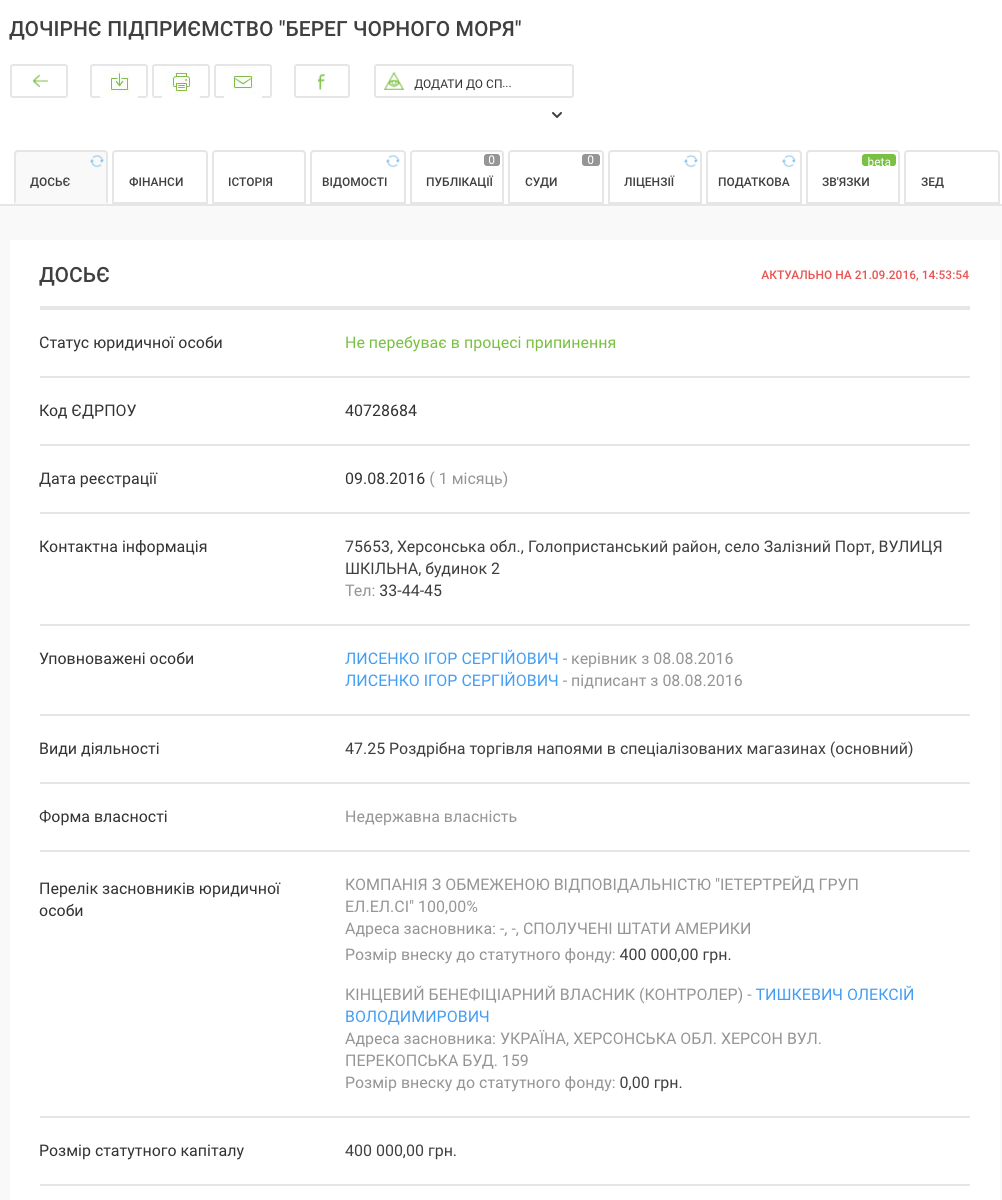 Во всех пакетах документов трех дочерних компаний Intertrade Group LLC, направленных в Голопристанскую РГА, официальным представителем (доверенным лицом) является Алексей Тышкевич. Поэтому он якобы имеет право представлять указанное юридическое лицо Intertrade Group LLC и проводить подобные регистрационные действия.