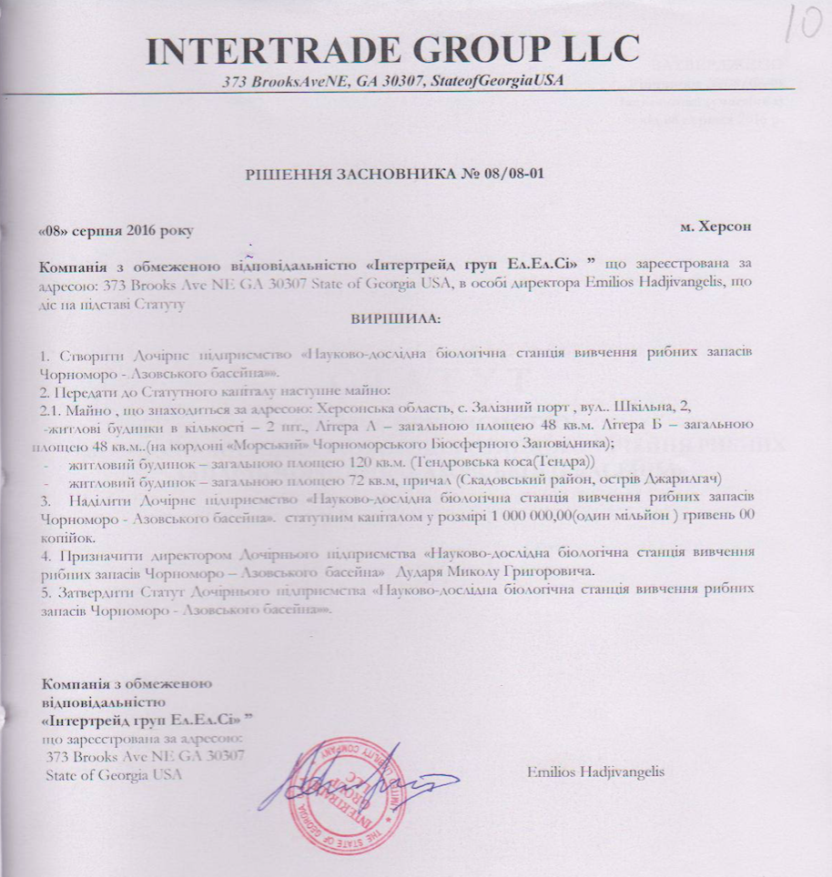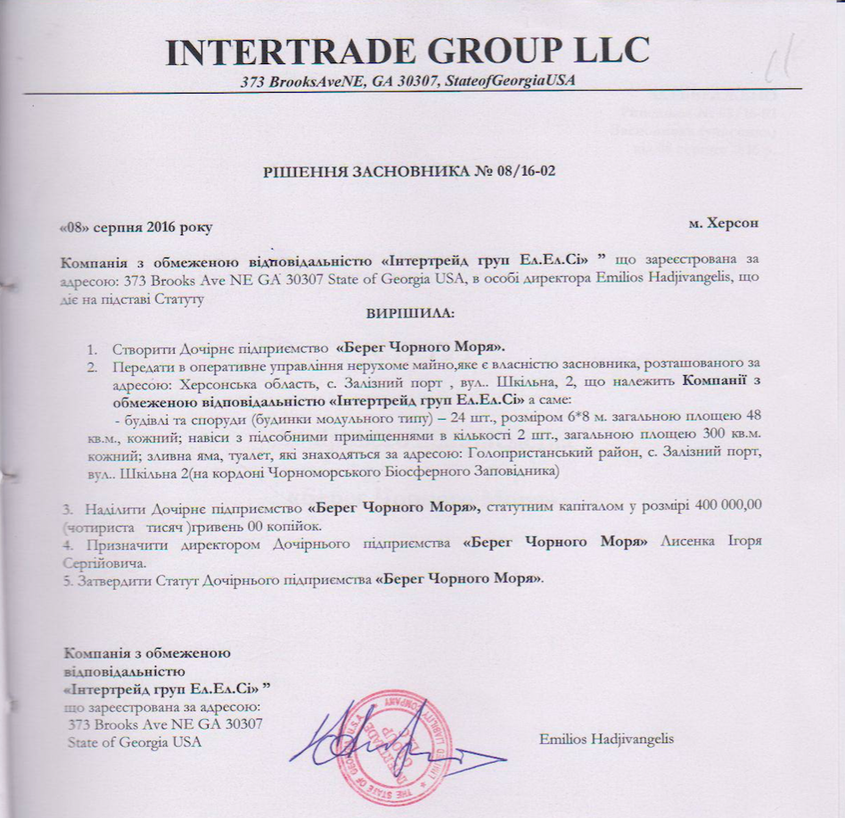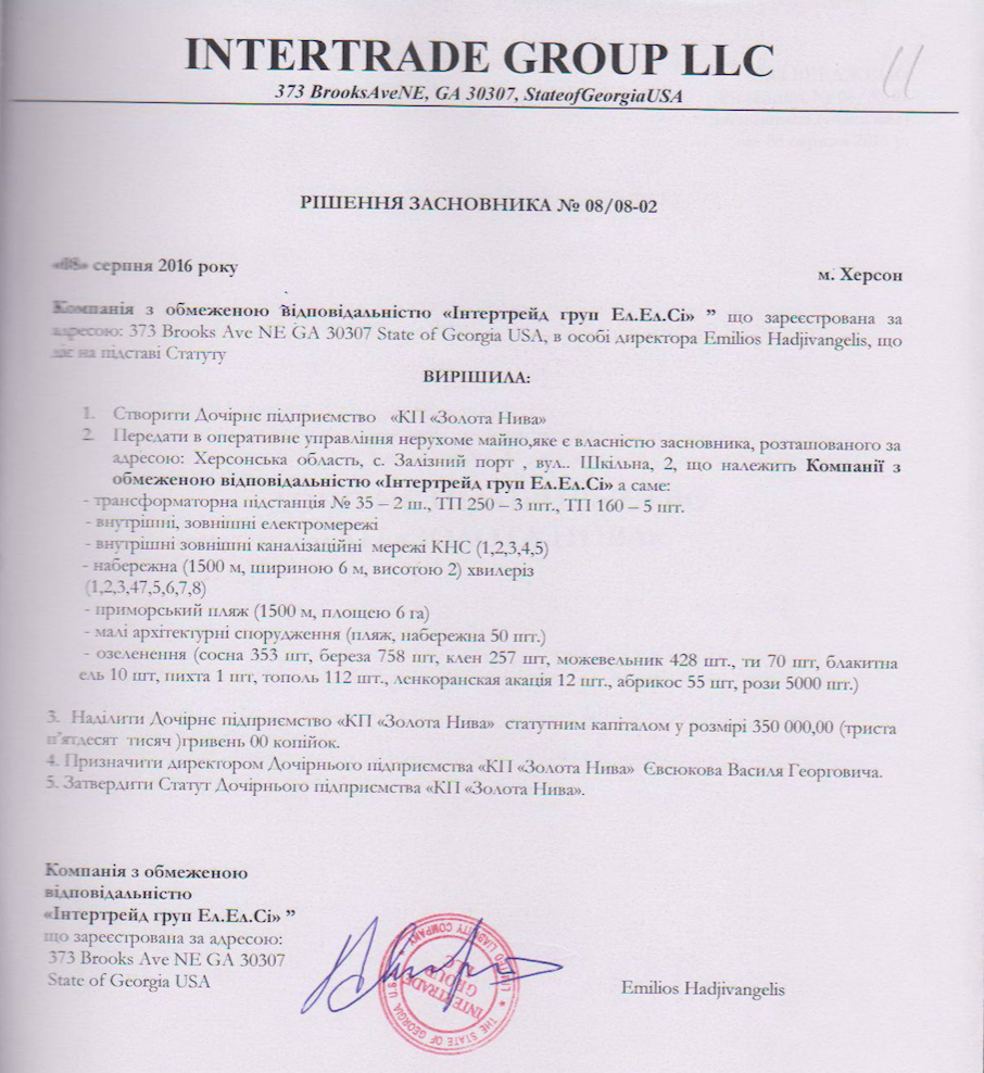 От редакции «Херсонских Вестей»: Исходя из полученных документов мы получаем следующую мошенническую схему: ликвидированное предприятие из США Intertrade Group LLC регистрирует три дочерних предприятия и передает в их оперативное управление государственное имущество, которое было внесено в реестр прав собственности по фиктивным договорам. Дальше эти объекты продаются третьим лицам, а органы власти и сельский совет на долгие годы погружаются в борьбе за свое имущество в судах.