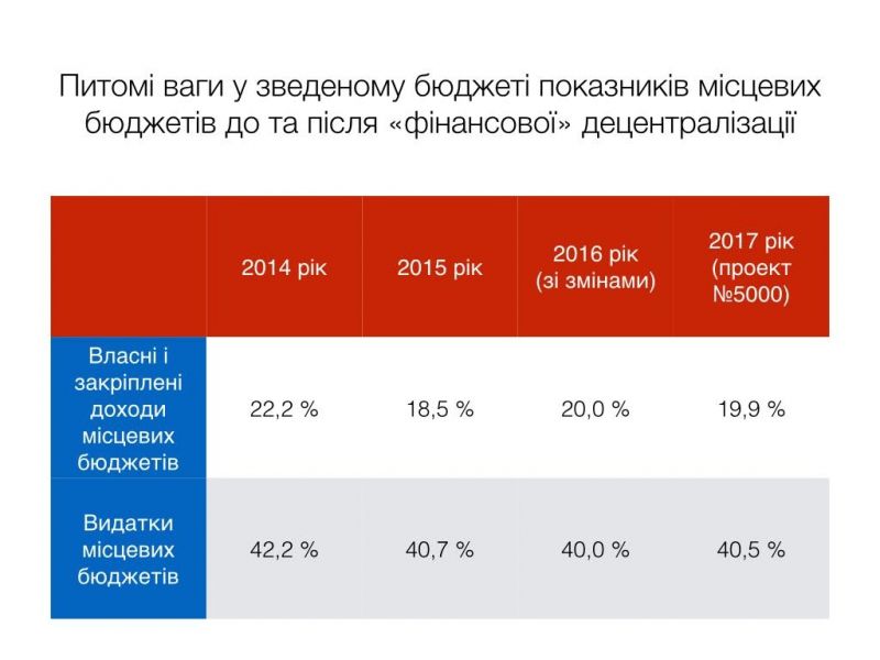 - Відсутність реальної децентралізації. Проведена фінансова децентралізація кардинально не змінює ситуацію із розподілом фінансових ресурсів між рівнями бюджетів. Питома вага у зведеному бюджеті як власних і закріплених доходів місцевих бюджетів так і їх видатків у 2017 році менші за показники 2014 року.