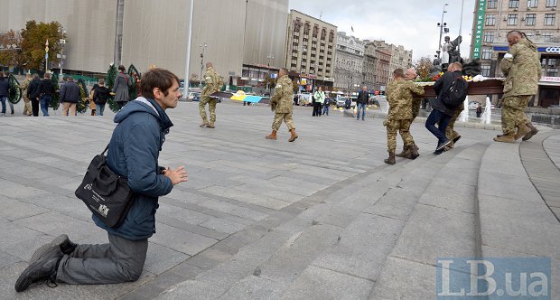 На Майдане Незалежности в Киеве в среду прошла церемония прощания с известным волонтером Юрием Мосиным (известный в соцсетях под ником Патриот Украины), который покончил жизнь самоубийством несколько дней назад.