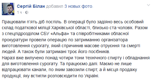 Вместе со спецподразделением СБУ «Альфа» и сотрудниками областной прокуратуры была проведена операция по задержанию организатора изготовления суррогата, который вызвал массовое отравление и смерти людей.