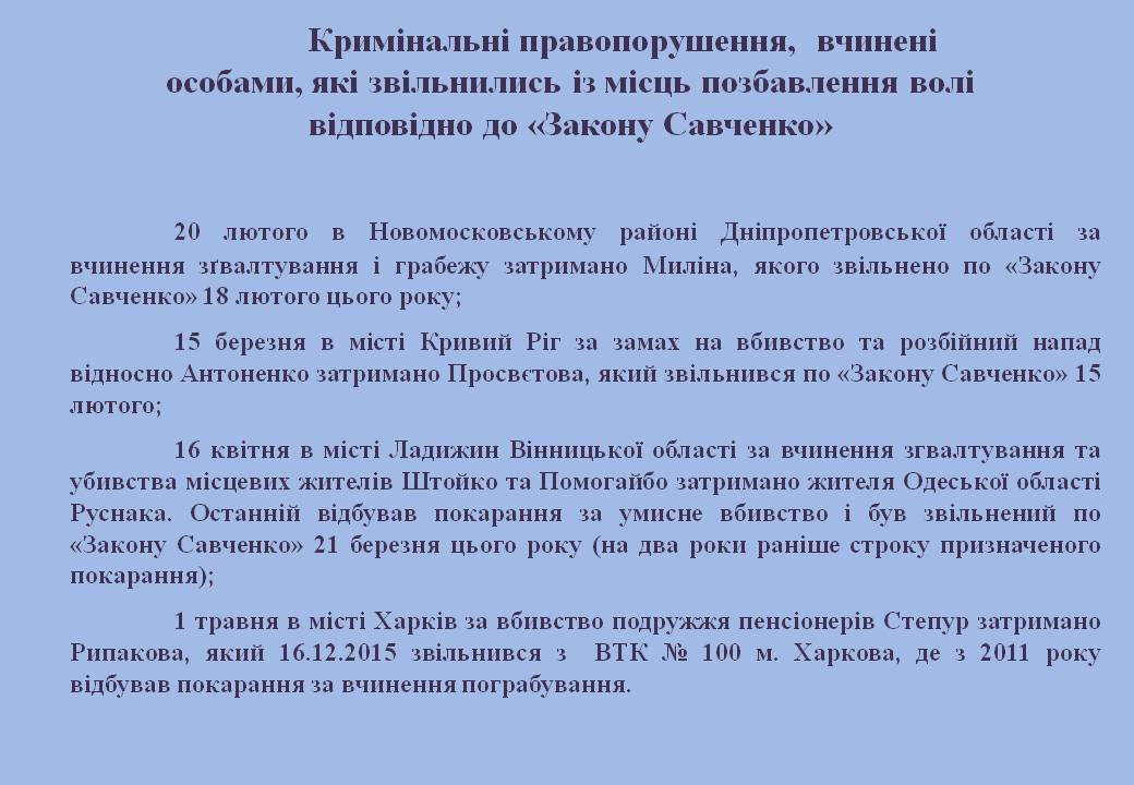 Раніше міністр юстиції П.Петренко повідомив, що 908 звільнених за "законом Савченко" скоїли повторні тяжкі злочини.