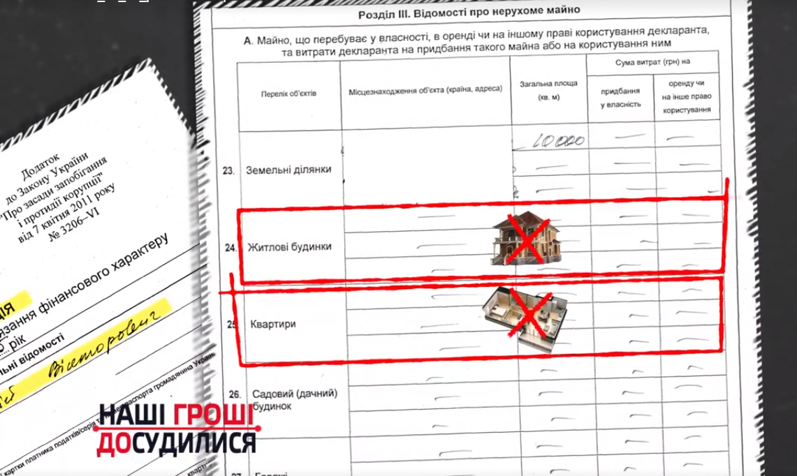 Как выяснили журналисты передачи "Наші гроші. Досудилися", дом и квартиру Валерий Драный записал на жену Ирину, с которой, по документам, находится в разводе, но продолжает жить совместно.