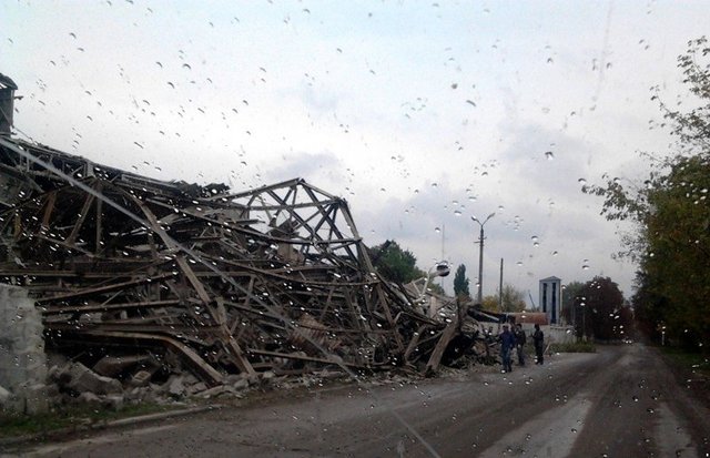 Раньше по этой канатной дороге на завод доставляли мергель из карьера. Было производство - теперь груда металлолома. В ближайшие дни все это вывезут. ДНР - все только начинается.