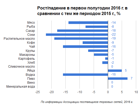 Директор Ассоциации поставщиков торговых сетей Алексей Дорошенко сравнивает продажи продуктов питания в первом полугодии 2015 и 2016 гг. «Украинцы стали меньше есть», - пишет он и добавляет, что потребление продуктов упало до уровня 1996 г. По его словам, товарооборот торговых сетей за последние два с половиной года сократился на 33%.