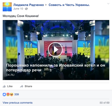 Видео, на котором известная журналистка Соня Кошкина обращается к Порошенко с вопросом и репликой. Он теряется с ответом и заканчивает фразой: «я - ответственный президент». Более 1200 шеров, 339 лайков и 69 комментариев. В комментариях - унизительные реплики, сравнение с фашизмом и обвинения в бездействии.
