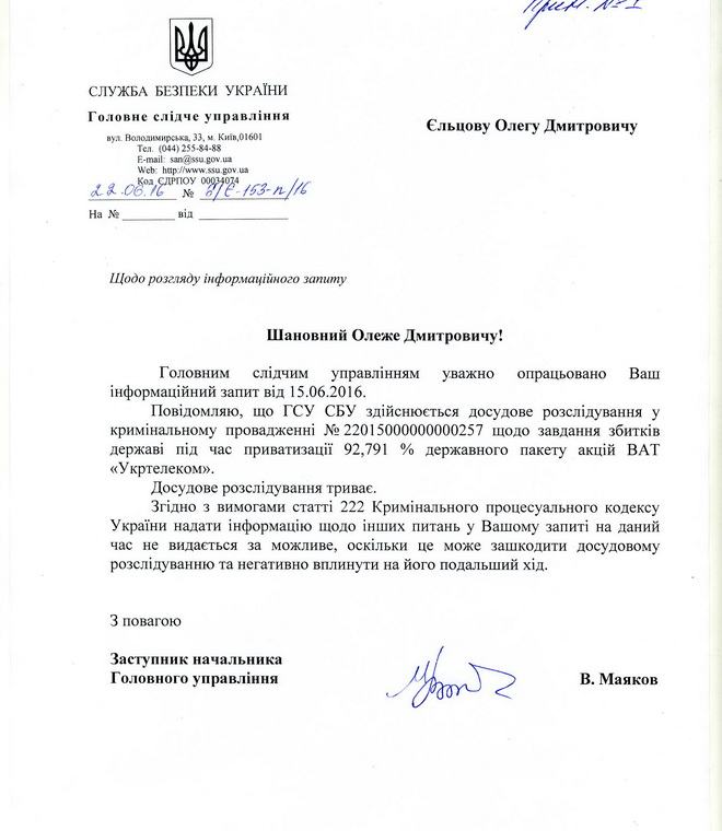 А первой про расследование дела о растрате 220 млн. гривен госбюджета на создание спецсвязи в 2014 году заявило СБУ. Сегодня же СБУ проводит следствие в криминальном производстве № 22015000000000257 от 02.09.2015 по части 2 ст. 364 Уголовного Кодекса Украины (злоупотребление служебным положением) по факту приватизации 92,791% госпакета акций ОАО «Укртелеком» по заниженной стоимости. Впрочем, реальных следственных действий спецслужба не ведет. Это подтверждает и формальный ответ на мой информационный запрос в СБУ по сути уголовного расследования. Все покрыто мраком тайны следствия, так сказать. Что здорово помогает скрывать собственную бездеятельность. Кроме того, в Едином реестре судебных решений нет ни одного решения по запросу следствия СБУ, касающегося компании ЕСУ. Зато есть около двух десятков решений суда на запросы следователей прокуратуры на проведение оперативно-розыскных мероприятий, доступ к базам данных операторов мобильной связи и к документам государственных банков, выдавших компании ЕСУ миллиардные кредиты без возврата...