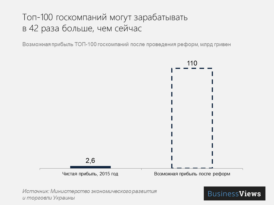 Расчеты показывают, что сотня крупнейших компаний способна заработать 110 миллиардов гривен — это в 42 раза больше, чем в 2015 году. При условии, что качество управления будет таким же, как и в частном секторе, а политическое вмешательство и коррупция будут минимальными.