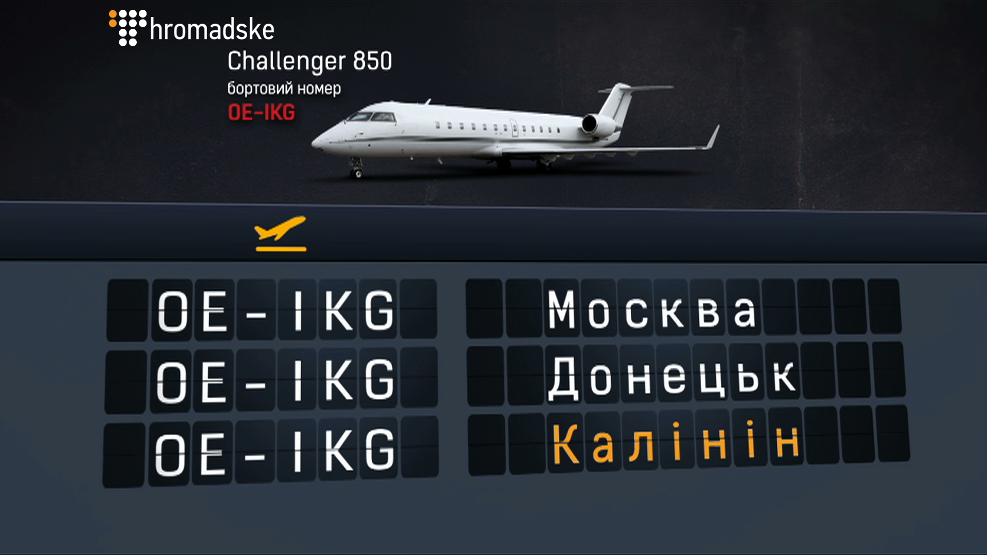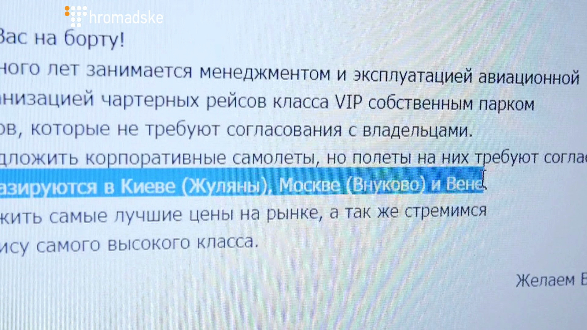 Самі літаки не обов’язково мають належати авіакомпанії. Вона може брати їх в лізинг. А от клієнти та рейси – це вже напрацювання самої «Бізнес-Ейрланз». В колонці «Клієнт» чимало відомих прізвищ: Порошенко, Ющенко, Клюєв, Азаров, Льовочкін, Богатирьова. А ось в серпні 2012-го чартер з Сімферополя в Ніццу, а потім в Тель-Авів та Москву замовляла людина з прізвищем «Кіркоров». Всі вони користувалися ось цією Цессною Сайтешн Соверейн. Її бортовий номер OE-GBY. Вартість одного перельоту, наприклад до Харкова, – вісім тисяч євро. До швейцарського Цюріха – двадцять одна тисяча євро. А ось на цьому Челенджері 850 літали клієнти з прізвищами Черновецький, Арбузов, Лєпс. Чимало рейсів в Москву та Донецьк здійснив клієнт з прізвищем Калінін. В часи Януковича людина з таким же прізвищем очолювала Службу Безпеки України. Інший клієнт – Саламатін. Таке ж прізвище і в міністра оборони епохи Януковича.