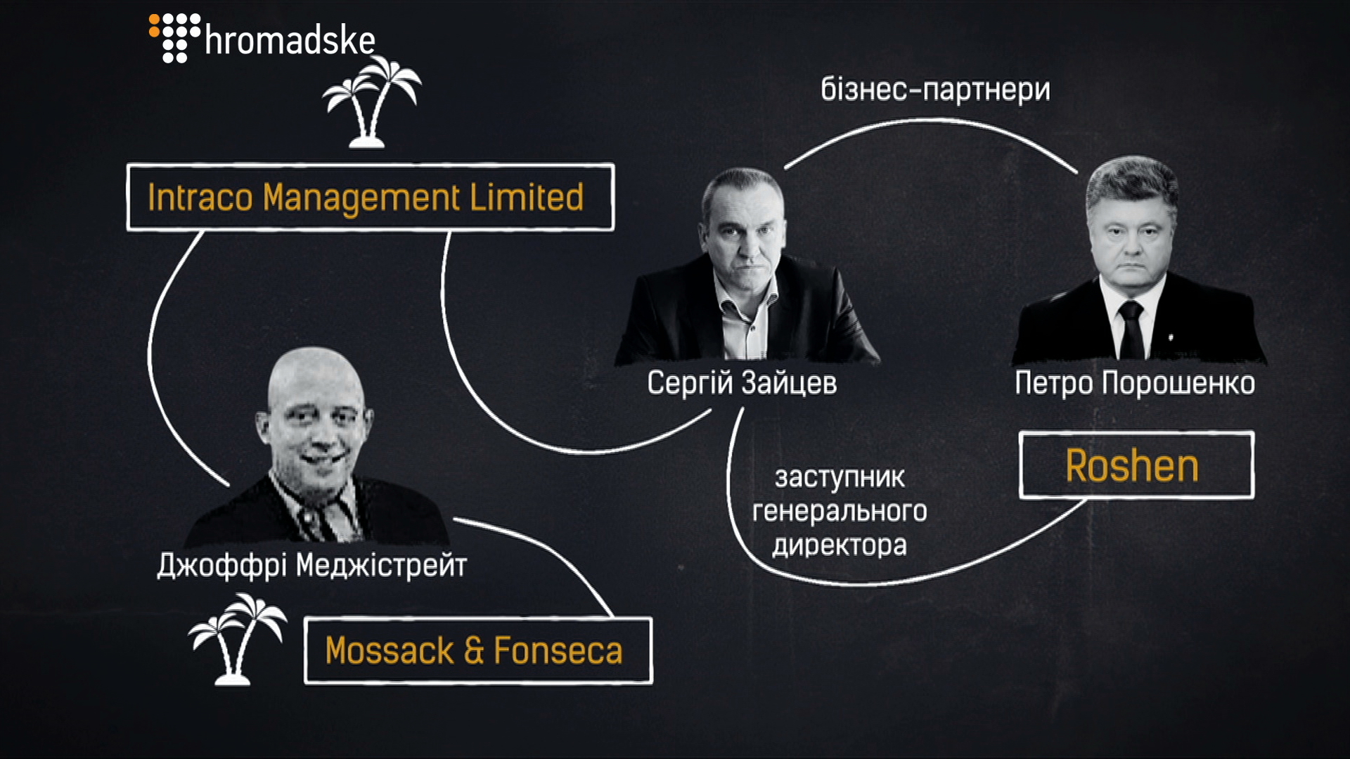 10-те січня 2002-го року. На Віргінських островах створюється нова компанія Intraco Management Limited. Завдяки масштабному витоку документів панамського реєстратора офшорів Mossack&Fonseca, тепер ми знаємо, що власником цієї фірми є громадянин України – Сергій Зайцев. Він же — однокласник Петра Порошенка і один з його перших бізнес-партнерів. Сьогодні Зайцев – заступник генерального директора кондитерської корпорації «Рошен». Директором в Інтрако Зайцев взяв собі Джофрі Меджістрейта. Це – людина не проста. Меджістрейт - відомий кіпрський юрист, який давно займається реєстрацією офшорів, і крім цього очолює кіпрське представництво панамської компанії Mossack&Fonseca.