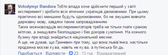 Така новина шокувала соцмережі. "Гриневич – це табачник у спідниці", "Паскуди!!!! Пробачте, вирвалося", "Все дуже просто. За гарними гучними промовами та обіцянками-цяцянками стирчать вуха "руського міра", "У цій державі нерви з дроту треба!", "Жах", "Ви дивуєтеся цьому закону, Кононенко МГУ закінчив, альо", - пишуть обурені користувачі соцмережі Facebook.