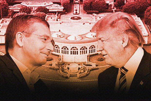 Вот еще одна отличная картинка. Догадайтесь, кто второй человек и почему он изображён вместе с Дональдом Трампом. На таком любимом Трампом фоне — рифление денежной бумажки.