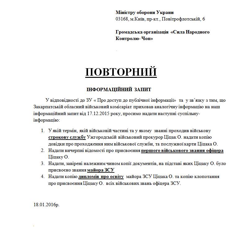 Лора Приходько вказує, що початково інформаційний запит був направлений у січні 2016 року до Міністерства оборони з проханням надати інформацію про проходження військової строкової служби Олега Ціцака, про вичерпні відомості щодо присвоєння першого військового звання офіцера, копії документів з присвоєнням звання майора ЗСУ, диплом про освіту.