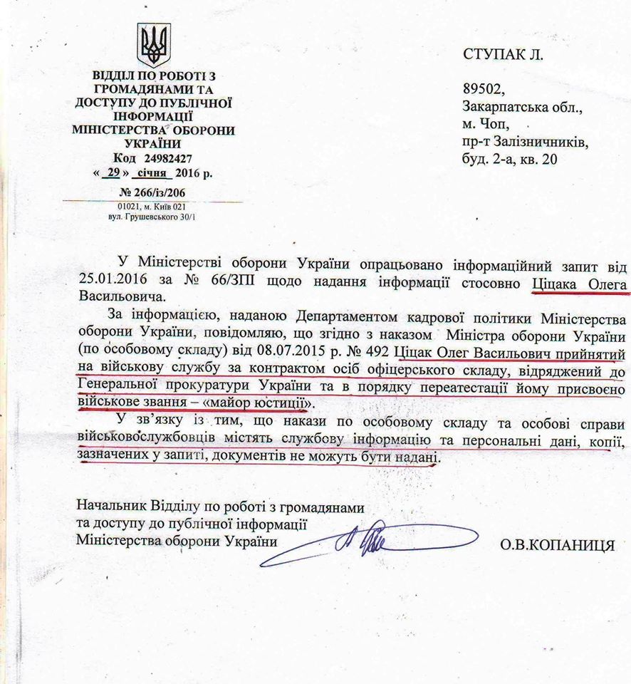 У Департаменті також вказали, що Олег Ціцак був прийнятий на військову службу за контрактом осіб офіцерського складу. Ціцак був відряджений до Генеральної прокуратури та в порядку переатестації йому було присвоєно військове звання – «майор юстиції».
