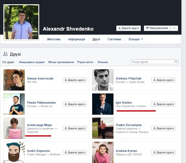 Итак, еще один защитник конторы Александр Шведенко. Это не бот. Много друзей, и с фотографиями все в порядке. Однако, в друзьях у Александра Шведенко есть Игорь Кустов, о котором мы рассказывали в предыдущей статье, Александр Мара – заявленный в комментариях под статьей, как директор по развитию SalesHub, Алексей Игнатьевич (в друзьях у вышеупомянутого бота) и Jimmy Zhang (в друзьях у вышеупомянутого бота) и Сергей Третьяк, который скорее всего тоже является сотрудником SalesHub или учеником. Александр Шведенко также полюбил страницу Кустова.
