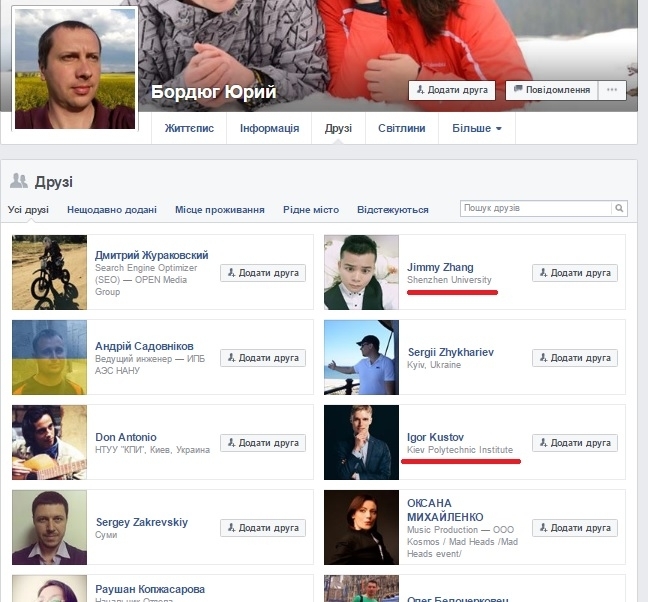 Еще один горячий защитник, Бордюг Юрий, также не является ботом SalesHub. Однако в друзьях у него все те же: Игорь Кустов, Jimmy Zhang, Alina Grysenko с пометкой Works at SalesHub и упомянутый в статье “американский эксперт” Joseph Cash.