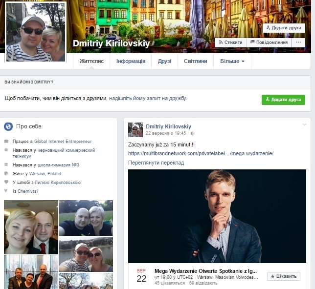 Дальше – Дмитрий Кирилловский, который также не является ботом. Живет в Варшаве и под брендом SalesHub уже активно читает тренинги в Польше. Следовательно, эти ребята уже активно выходят на Европу! Друзья скрытые, но есть много фотографий с символикой SalesHub и фото с Игорем Кустовым.