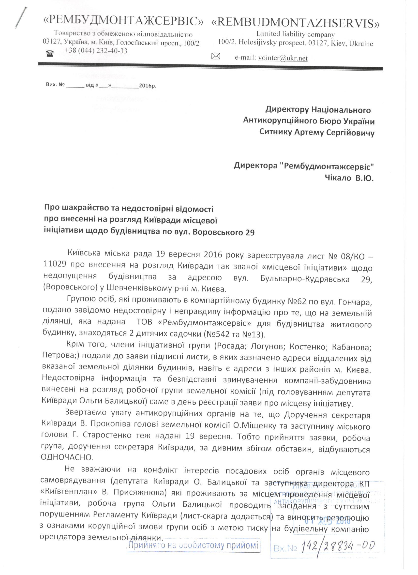 В Национальное Антикоррупционное бюро Украины и Генеральную прокуратуру 10 октября 2016 года поступило обращение компании “Рембудмонтажсервис”, в котором девелоперы указывают на факты мошенничества, имевшие место при внесении на рассмотрение и непосредственно рассмотрении Киевсоветом местной инициативы “по недопущению строительства по улице Бульварно-Кудрявская, 29”.