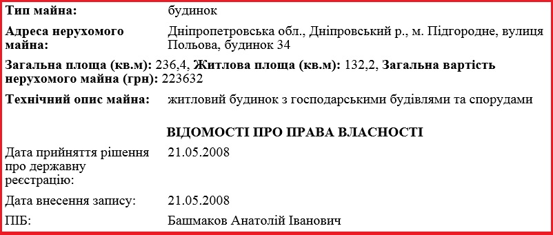 Батьки Башмакова теж мають нерухомість, по будинку на кожного. Так, за даними Державного реєстру речових прав на нерухоме майно, батько Башмакова, Анатолій Іванович, на пару місяців раніше за сина став власником будинка площею 236,4м² у с.Підгородне, Дніпровського району.