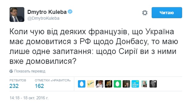 Также известный украинский дипломат Дмитрий Кулеба не обошел стороной заявление французского МИДа, проведя параллель между преступными действиями РФ в Украине и Сирии.