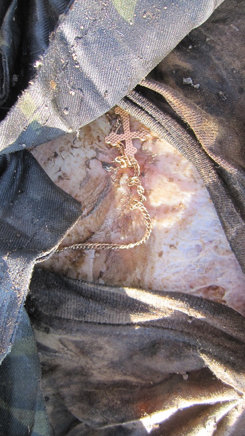 На шее на черном шнурке крестик белого металла. Но, что важно — у бойца на левом плече — тату в виде трезубца размером 12×5 см. С одной стороны, это мог быть погибший в первой половине мая 2015 года, но за то время среди наших боевых потерь нет пропавших без вести (по крайней мере, с такими признакам). Поэтому напрашивается вывод, что это мог быть погибший в более раннее время — например, во время боев за Донецкий аэропорт. Или вообще кто-то из казненных заключенных. И его тело длительное время хранилось в морге Донецка. Еще один вариант — погибший неизвестный донецкий партизан.