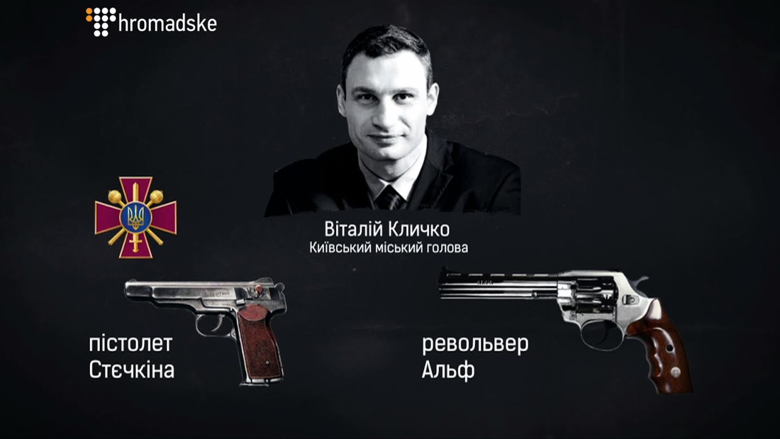 Владельцем 2-х наградных единиц оружия является также Виталий Кличко. У мэра столицы есть автоматический револьвер Стечкина от министра Полторака и револьвер «Альф» от министра Авакова. Зачем лучшему боксеру мира оружие — киевский глава объясняет, как всегда: лаконично.