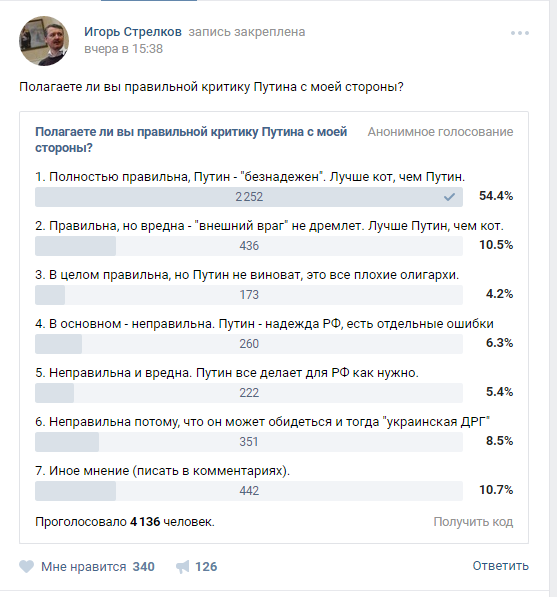 Еще более показательным тут является голосование у него на странице, которое он разместил вчера. Своим читателям Стрелков предложил оценить правильно ли он критикует Путина. Из более чем 4 тысяч проголосовавших более 50% ответило, что Путин безнадежен.