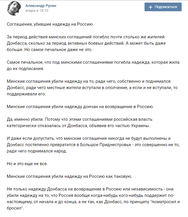«Минские соглашения убили надежду на Россию как таковую. Не только надежду Донбасса на возвращение в Россию или независимость - они убили надежду на то, что Россия вообще когда-нибудь кого-нибудь поддержит по-настоящему, от начала и до конца, а не так, как Донбасс, по принципу «поматросил и бросил».