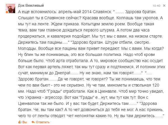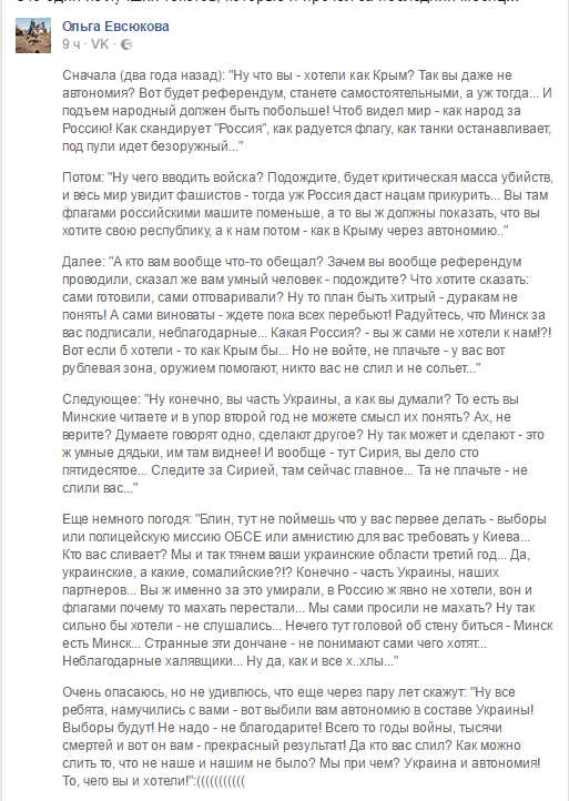 Ну и еще немного «зрады» от простых граждан и рядовых «ополченцев». На мой взгляд, эти посты очень хорошо иллюстрируют эволюцию тезисов роспропаганды и тех обещаний, которые она раздавала сепаратистам Донбасса.