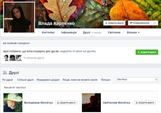 Отметим, что никакой информации, свидетельствующей об отношениях с известным радикалом, нет и на странице самой Влады. При этом дружит она в соцсети с большинством его знакомых (среди которых и свидетели на их свадьбе - Андрей Лозовой и Ольга Виноградова), отцом и сыном Мосийчука.