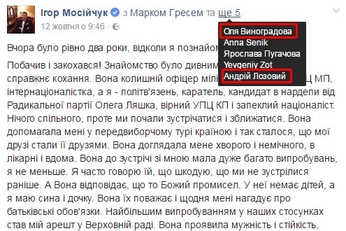 Примечательно, что в трогательном посте о второй годовщине знакомства с любимой женщиной Мосийчук отметил 6 человек, в том числе Лозового и Виноградову.