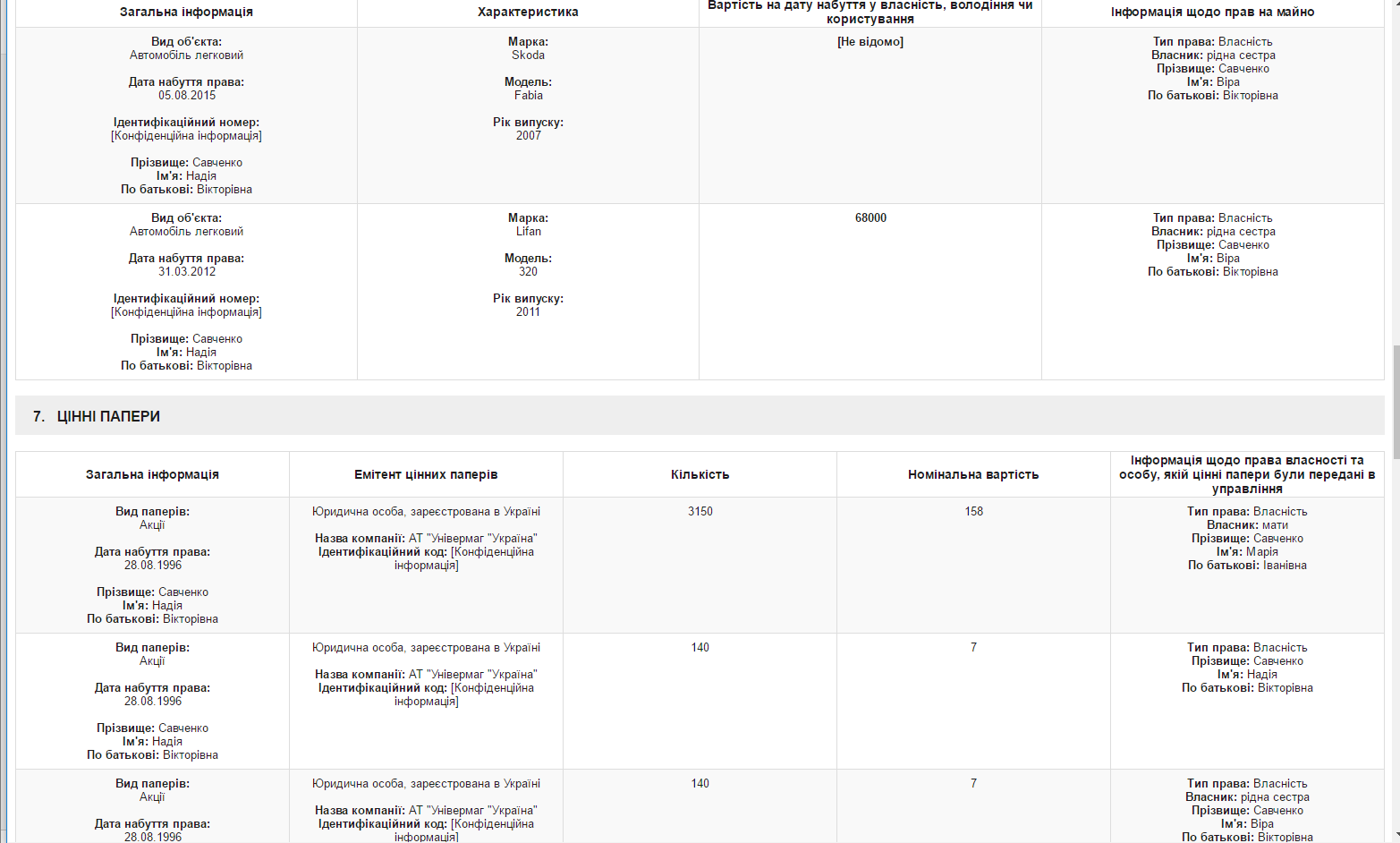 Согласно декларации, семья нардепа владеет акциями киевского универмага «Украина». Да, Надежда и Вера Савченко имеют по 140 акций, а их мать, Мария Ивановна Савченко имеет 150 акций.