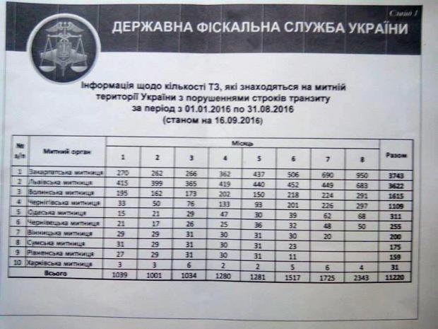 І, нарешті, "вишенька на тортику". Є копія одного з документів перевірки, де міститься зведена інформація щодо кількості транспортних засобів, які знаходяться на митній території України з порушенням строків транзиту за період з 1 січня по 31 серпня 2016 року: