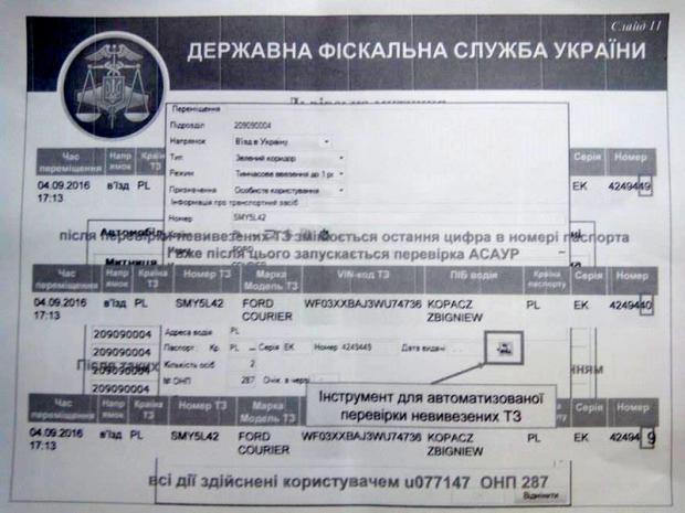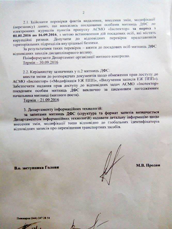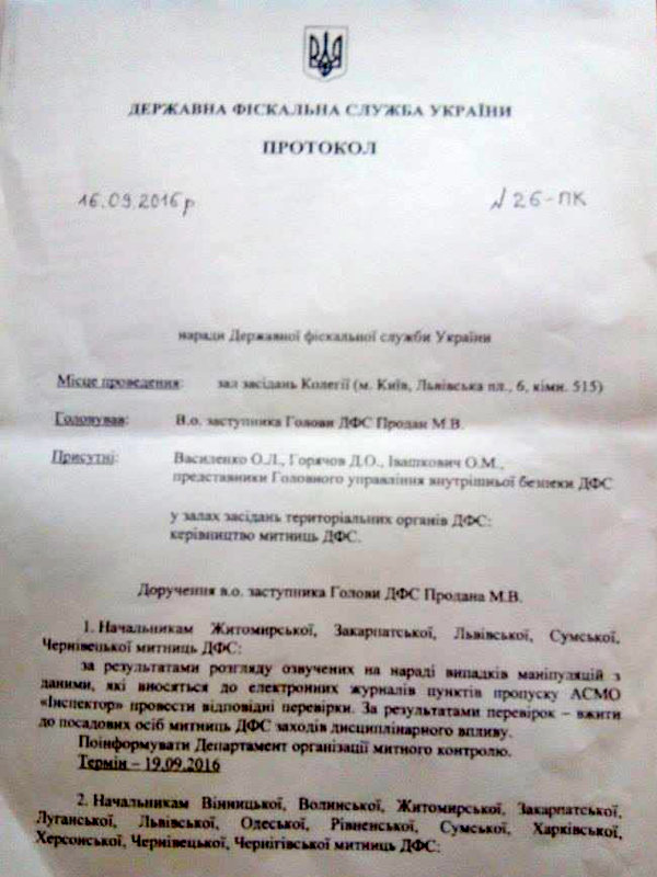 Згідно з протоколом наради Державної фіскальної служби України від 16.09.2016 року № 26-ПК під головуванням в.о. заступника голови ДФС Мирослава Продана, який є в розпорядженні редакції, керівництво служби виявило масштабні зловживання та маніпуляції з даними, які вносяться до електронних журналів пунктів пропуску АСМО "Інспектор". Відповідно начальникам Житомирської, Закарпатської, Львівської, Сумської та Чернівецької митниць ДФС доручено здійснити відповідні перевірки, а до посадових осіб митниць ДФС вжити заходів дисциплінарного впливу. Цим же протоколом зобов’язано начальників Вінницької, Волинської, Житомирської, Закарпатської, Луганської, Львівської, Одеської, Рівненської, Сумської, Харківської, Херсонської, Чернівецької та Чернігівської митниць ДФС здійснити перевірки фактів видалення, внесення змін, перезапису даних, що вносилися посадовими особами митниць ДФС до електронних журналів пунктів пропуску АСМО "Інспектор" за період з 1 січня по 16 вересня 2016 року з метою встановлення дій, які містять корупційні ризики.