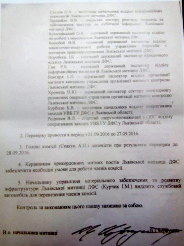 Є також копія наказу Львівської митниці ДФС від 21 вересня 2016 року № 506 про проведення перевірки, про яку йшлося на нараді ДФС від 16 вересня 2016 року.