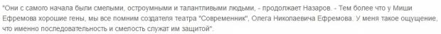 Режисер зазначає, що Єфремов, Орлов, а також їхній колега Дмитро Биков завжди дотримувалися такої позиції і були сміливими у своїх заявах. До цього, за словами Назарова, відносяться зовсім по-іншому. Звикають, що є такі "вороги" держави.