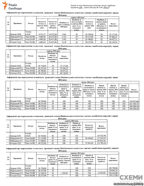 Чотири члени Національного агентства із запобігання корупції щомісяця отримували до свого основного окладу дві надбавки та премію у розмірі місячної зарплати, у результаті замість одного стандартного окладу члени НАЗК отримували по чотири.