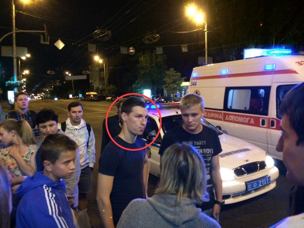 Але далі почалось саме цікаве. На фото в чорних футболках 2 пасажира із машини. Обведений червоним за словами свідків якраз водій. На фото ми бачимо вже автомобіль ДАІ і швидкої, також була на місці міліція.