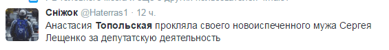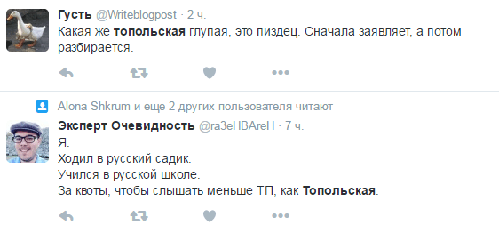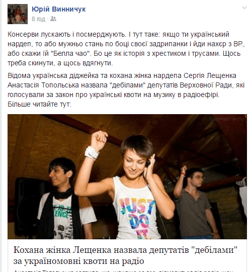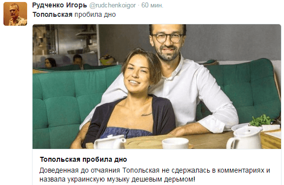 "Скажу просто: интернационализм и космополитизм - это, наверное, очень красивые и модные слова.Но не во время упадка, взлома внутренней и внешней парадигмы, и, тем более, не во время войны. Не знаю, что за программу на KISS FM вела Топольская, однако убежден, что без нее современная украинская культура, в том числе электронная, ничего не потеряет, потому что не может когнитивно оскопленный человек производить что-то стоящее".