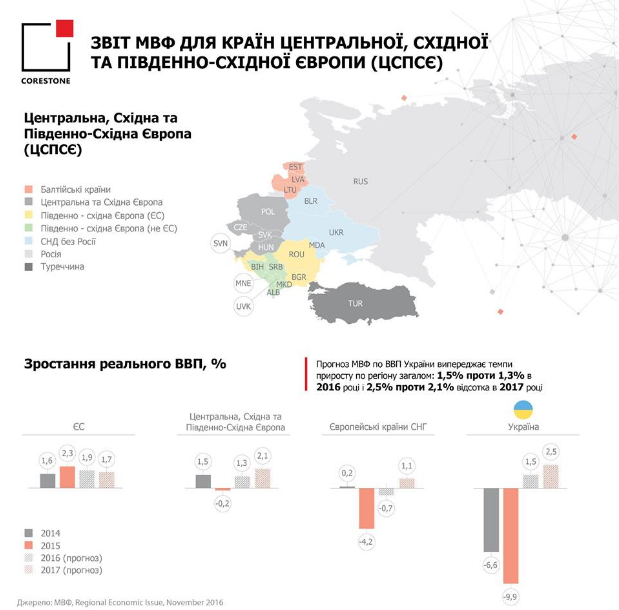 При этом прогноз ВВП по Украине опережает прогноз в целом по региону, что является следствием низкой базы сравнения за 2015 год.