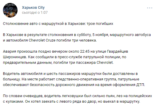 По словам очевидцев, пишут в группе Харьков City в ВКонтатке, водитель легковушки был сильно пьян, лез на полицейских с кулаками. Он хотел заехать с левого ряда во двор, но въехал в маршрутку.