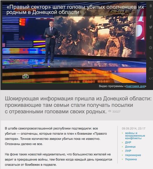 А уже 9 сентября телеканал НТВ рассказывал о том, что жители Донецкой области стали получать посылки с отрезанными головами своих родных и причастен к этому, естественно, правый сектор, вытворяющий такие зверства.