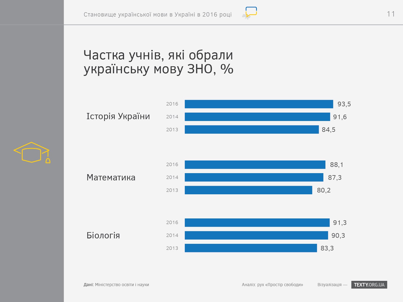 Державну мову для складання тестів ЗНО з історії України обрали у 2016 році 93% випускників, з математики – 88%, з біології – 91%.