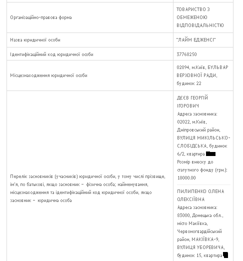 Так, в 2005 году была создана рекламная фирма ООО "Лайм-фреш БТЛ", где Георгий Деев является директором, а вместе с прописанной в Макеевке Еленой Пилипенко владеет равными долями в уставном капитале: