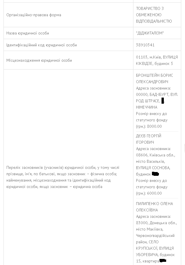 Георгий Деев и Елена Пилипенко, вместе с жителем Германии Борисом Бронштейном, являются учредителями еще одной фирмы - ООО "Диджитализм":